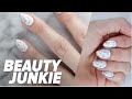 Like shattered-glass nails before them, the marble manicure is the next Instagram nail trend to take over the app. Marble, or granite nails, tend to stay in the white and gray realm — kind of like the slabs you see on the counters of iconic bathrooms and the floors of museums — and offer the person who isn't that into nail art an option that's chic, adult, and put together. There are a few ways you can create this trend at home. Polish the nails with an opaque white or even a shade with a cut of gray in it. For the first technique, crinkle a small amount of plastic wrap in your fingers, then dip it into a light gray and press onto the nail in varying patterns. Do the same with a deep gray. You can also utilize a foam makeup applicator or even try cutting a triangle sponge into smaller pieces and press those onto the nail with tweezers. The last option requires a steady hand, though: use a nail art brush to paint on the cracks yourself. Just be sure you thin out the black polish with acetone to get the "cracked" effect. Watch the video to see the techniques in action, and let us know if you're going to try these at home! Nails by Aja Wada.